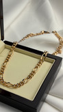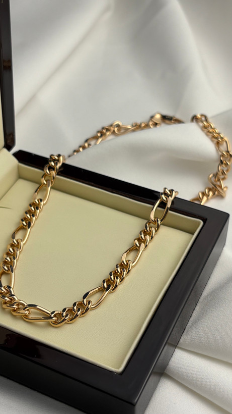 این گردنبند از آلیاژ مس با آبکاری طلا ژوپینگ ساخته شده که درخشش و دوام بالایی دارد. طراحی کلاسیک حلقههای فیگارو، جلوهای لوکس و مینیمال به گردن میدهد و با هر تیپ و استایلی بهراحتی ست میشود.