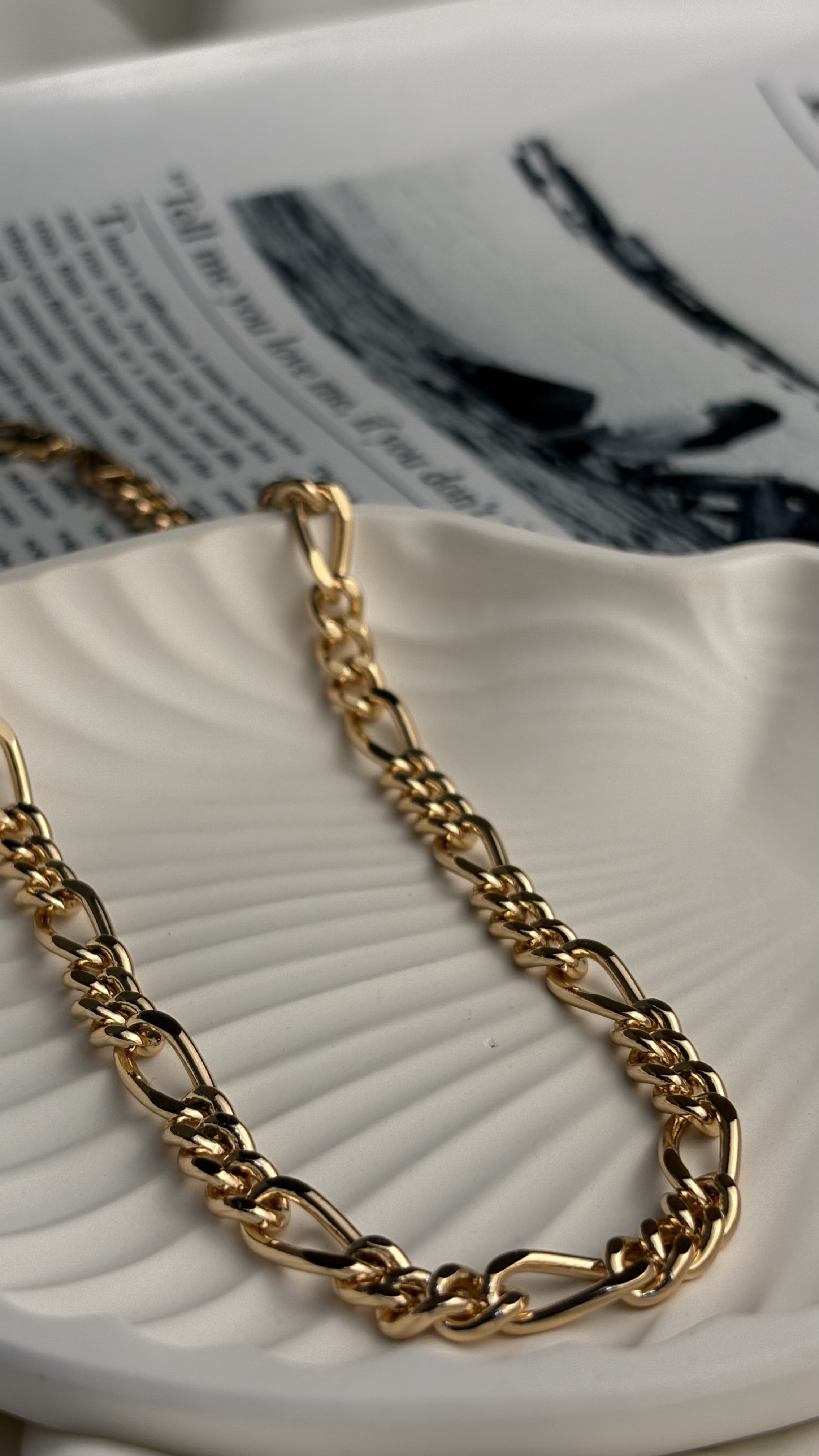 این گردنبند از آلیاژ مس با آبکاری طلا ژوپینگ ساخته شده که درخشش و دوام بالایی دارد. طراحی کلاسیک حلقههای فیگارو، جلوهای لوکس و مینیمال به گردن میدهد و با هر تیپ و استایلی بهراحتی ست میشود.