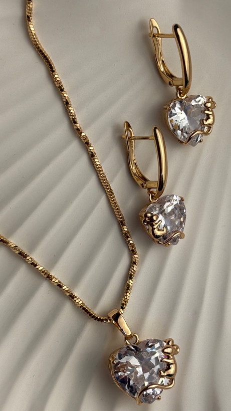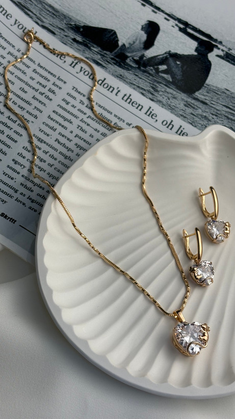 این نیمست زیبا شامل گردنبند و گوشوارههایی با طرح قلب نگیندار است که از آلیاژ مس با آبکاری طلا ژوپینگ ساخته شده و خاصیت ضد حساسیت دارد؛ بنابراین برای پوستهای حساس کاملاً مناسب است.
