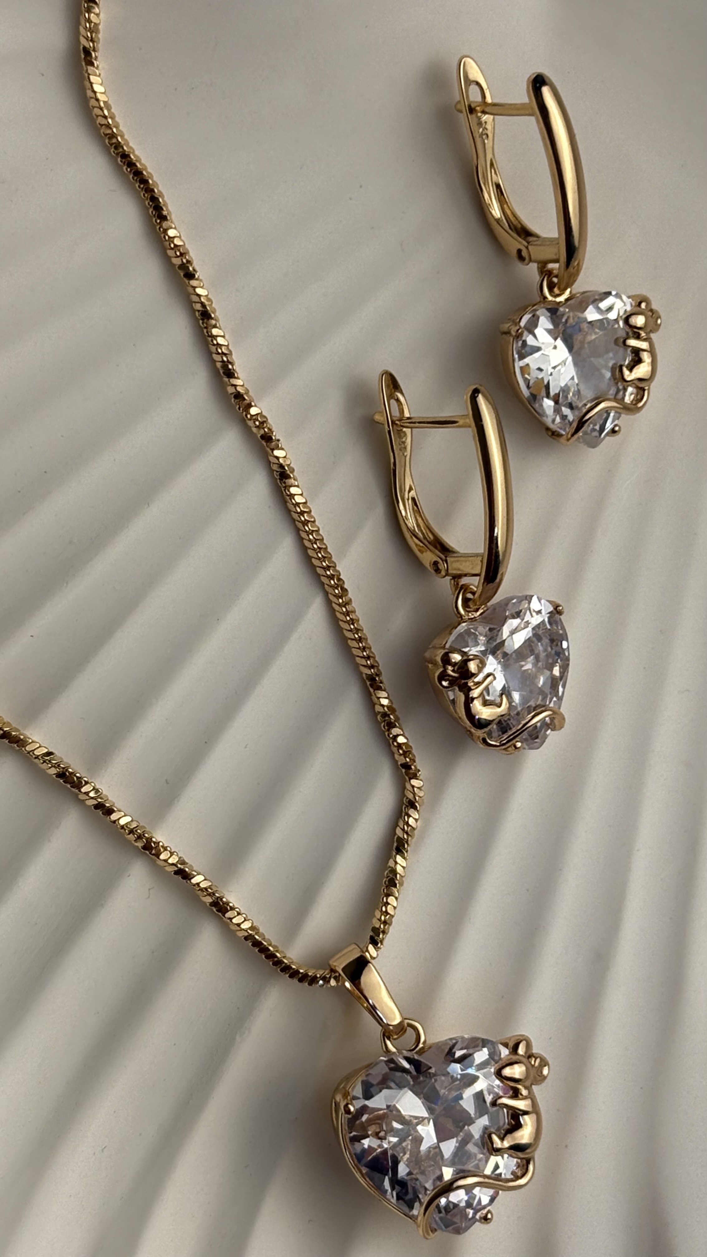 این نیمست زیبا شامل گردنبند و گوشوارههایی با طرح قلب نگیندار است که از آلیاژ مس با آبکاری طلا ژوپینگ ساخته شده و خاصیت ضد حساسیت دارد؛ بنابراین برای پوستهای حساس کاملاً مناسب است.